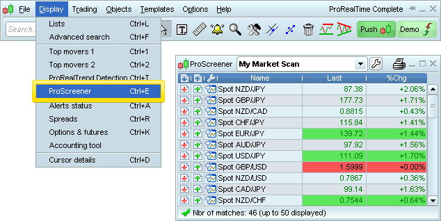 Tanpa diragukan lagi, ProScreener dari ProRealTime COMPLETE adalah salah satu alat paling populer karena kemampuannya dalam menganalisis ribuan aset di berbagai pasar keuangan dalam hitungan detik. Alat pintar, seperti peringatan real-time dan Band PRT memudahkan identifikasi peluang trading dan mengelola transaksi dengan efisien.