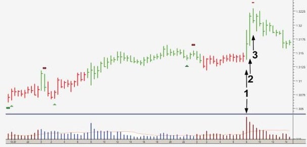 Perhatikan pada grafik bagaimana setiap kenaikan harga yang menandai perubahan arah didahului oleh peningkatan volume yang tidak proporsional.