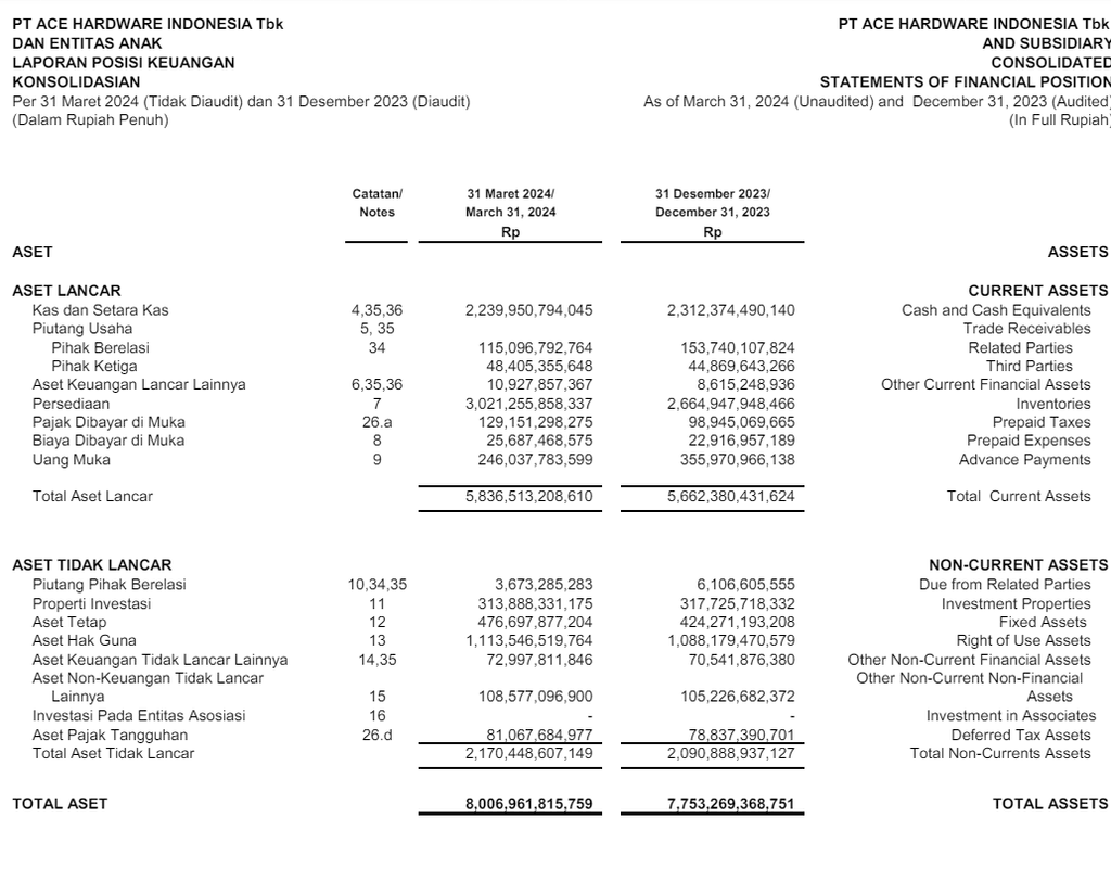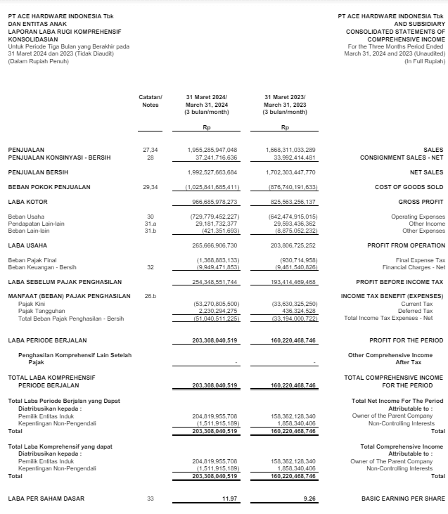 Mari kita lihat dalam contoh praktis bagaimana menghitung ROIC, dengan menggunakan perusahaan PT Ace Hardware Tbk (ACES) pada kuartal I-2024: