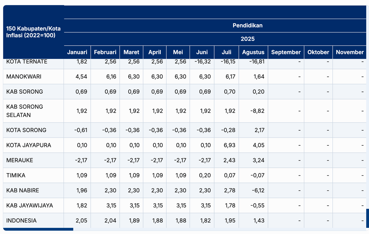 Kelompok pendidikan mengalami inflasi sebesar 1,95% pada Juli 2025. Tingkat inflasi ini menjadi tertinggi ketiga sepanjang tahun 2025.