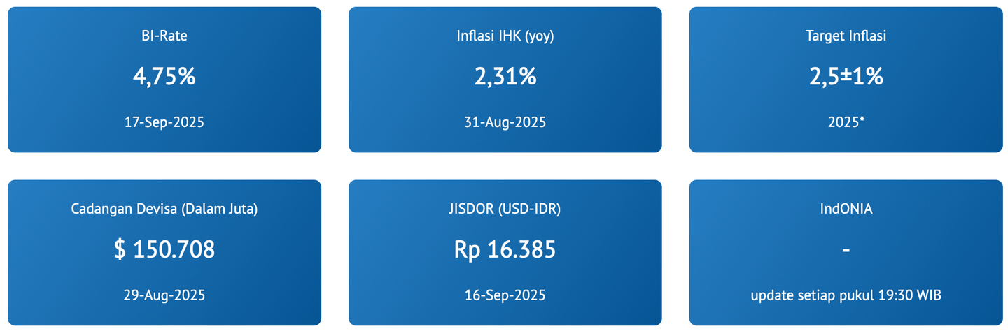 Dalam Rapat Dewan Gubernur (RDG) Bank Indonesia pada 16-17 September 2025 memutuskan BI Rate turun sebesar 25 bps menjadi 4,75%. Penurunan ini diikuti juga penurunan suku bunga Depocit Facility 50 bps menjadi 3,75% dan suku bunga Lending Facility 25 bps menjadi 5,5%.