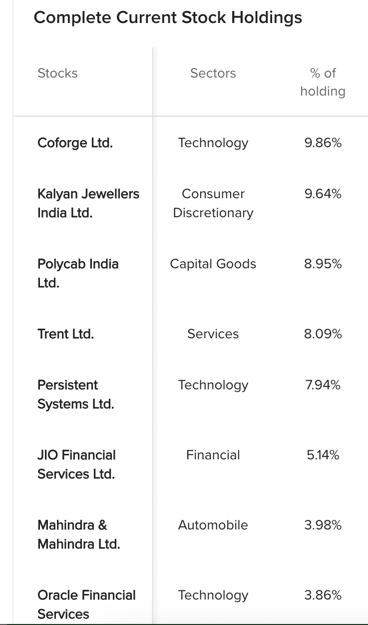 Reksa dana ini berinvestasi pada sektor teknologi, capital goods, jasa dan konsumsi. Manajer investasi reksa dana ini adalah Niket Shah dan tim dari Molital Oswal Mutual Fund.