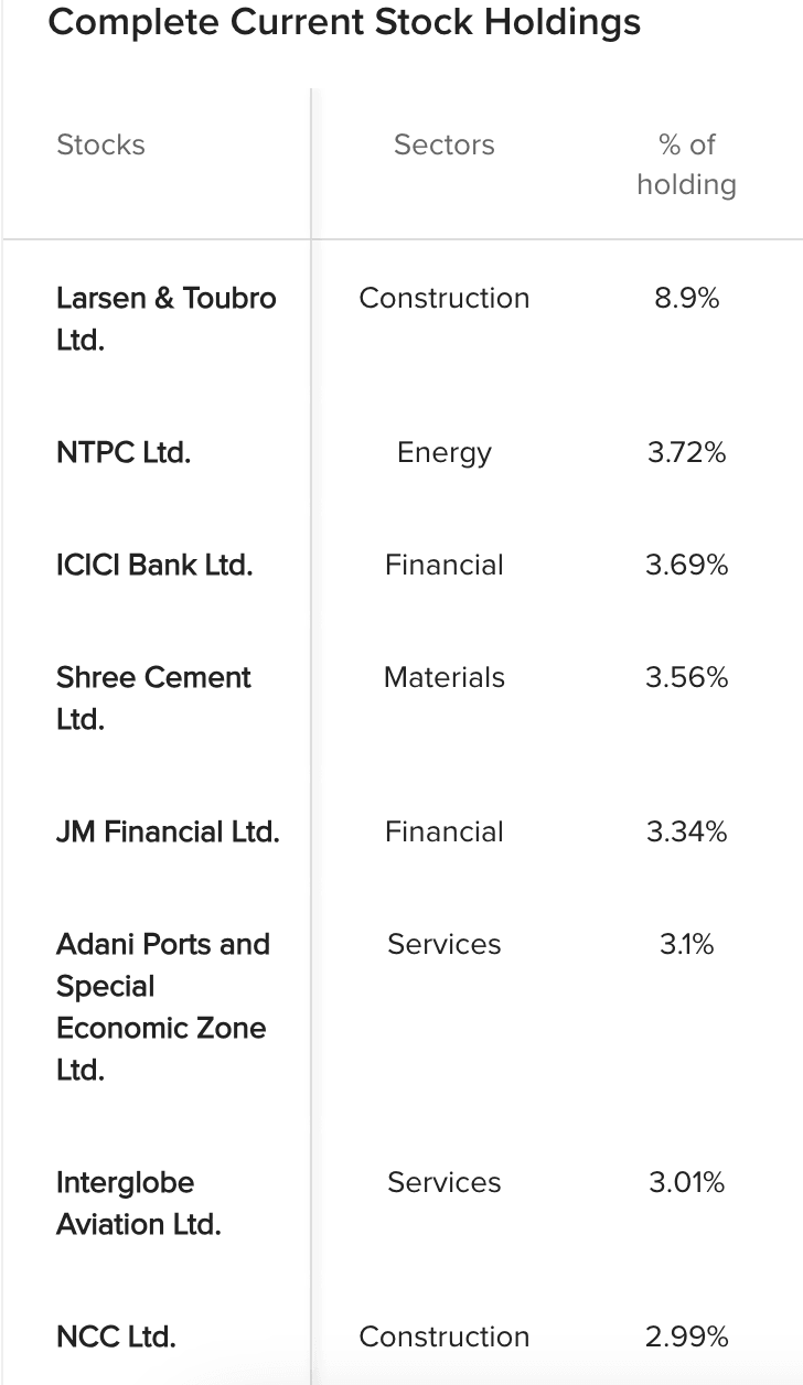 ETF ini umumnya akan menginvestasikan setidaknya 90% dari total asetnya dalam sekuritas yang membentuk indeks dasarnya, serta dalam ADR dan GDR yang mewakili sekuritas dalam indeks dasar tersebut. Indeks dasar adalah indeks yang ditimbang berdasarkan kapitalisasi pasar yang dimodifikasi, terdiri dari sekuritas ekuitas yang diperdagangkan di Bursa Efek Nasional India.