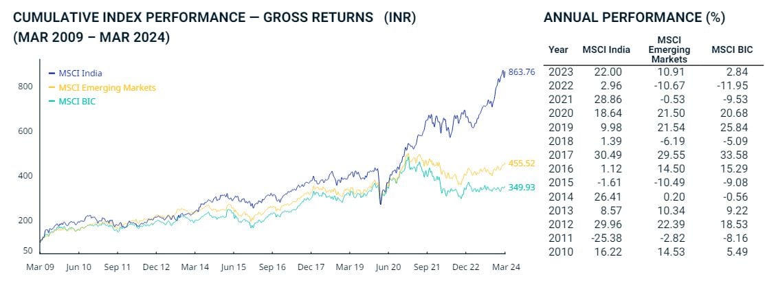 Perekonomian India mejadi salah satu yang tumbuh paling cepat tahun 2023. Grafik berikut, mencatatkan evolusi indeks MSCI India, menggambarkan dengan sempurna proses pertumbuhan ini.