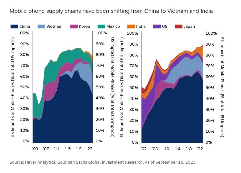 Faktanya, outsourcing teknologi dan proses bisnis menyumbang 60% dari ekspornya, sehingga mengindikasikan tren yang meningkat. Salah satu contoh transformasi ini adalah ekspor ponsel India, yaitu sebagai berikut:
