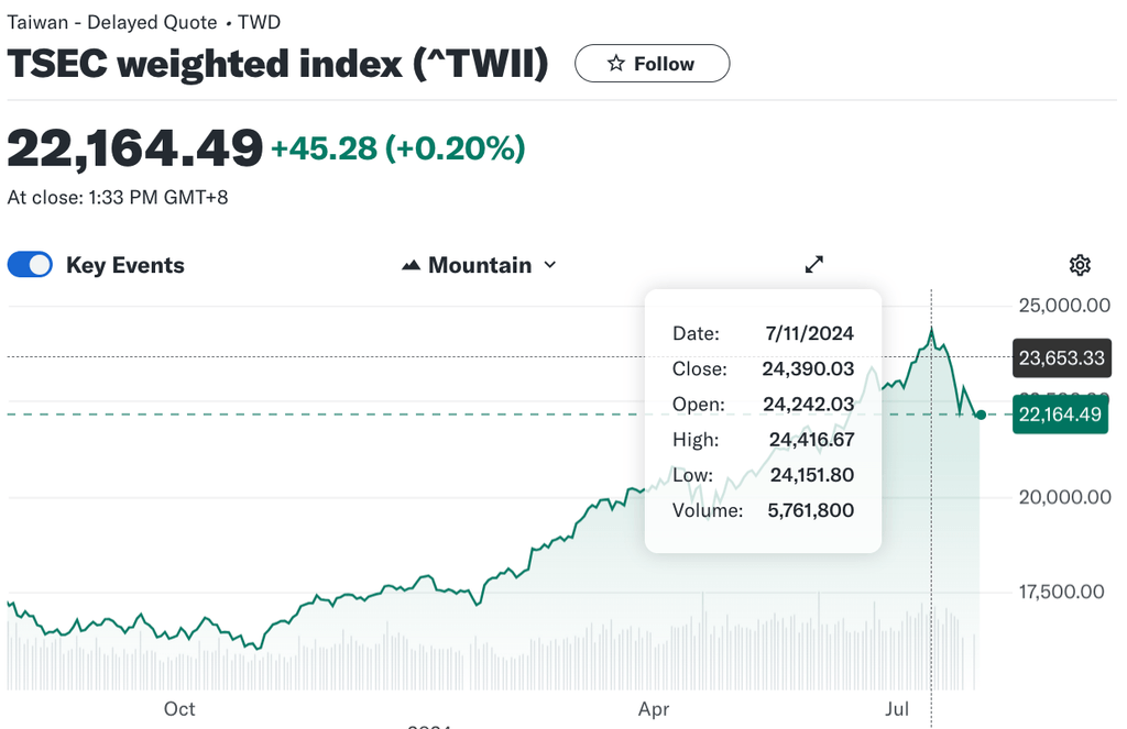 Selanjutnya, pada gamba di bawah kita dapat melihat TAIEX mencapai nilai tertinggi sepanjang masa pada tanggal 11 Juli 2024 dengan nilainya yang mencapai 24,390.