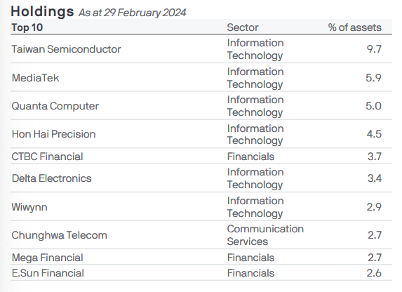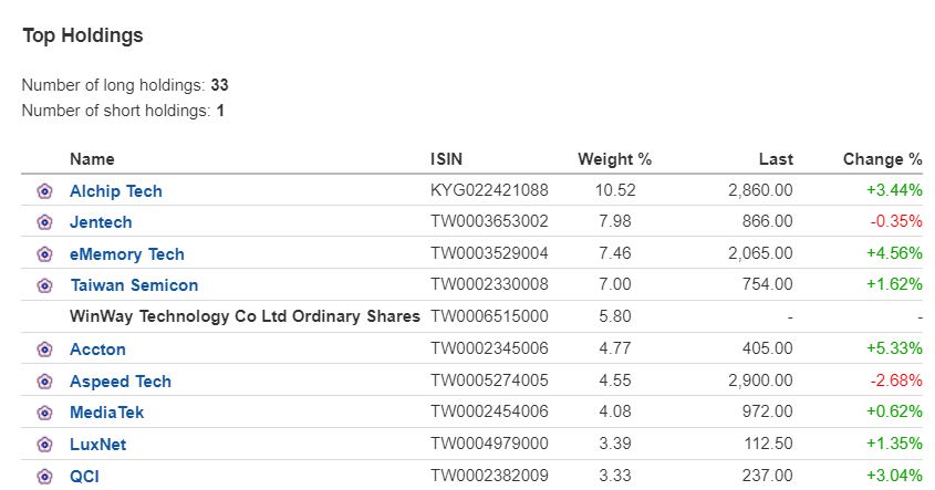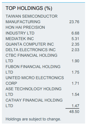 MSCI Taiwan merupakan indeks acuan dari sebagian besar ETF ini. Oleh karena terdiri dari 89 perusahaan Taiwan, mencakup 85% dari pasar saham negara ini.