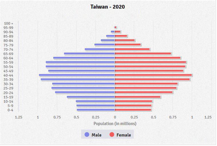 Berkaitan dengan demografinya, Taiwan tidak seperti kebanyakan negara maju karena populasinya relatif muda dengan sebagian besar penduduknya berusia di bawah 40 tahun.