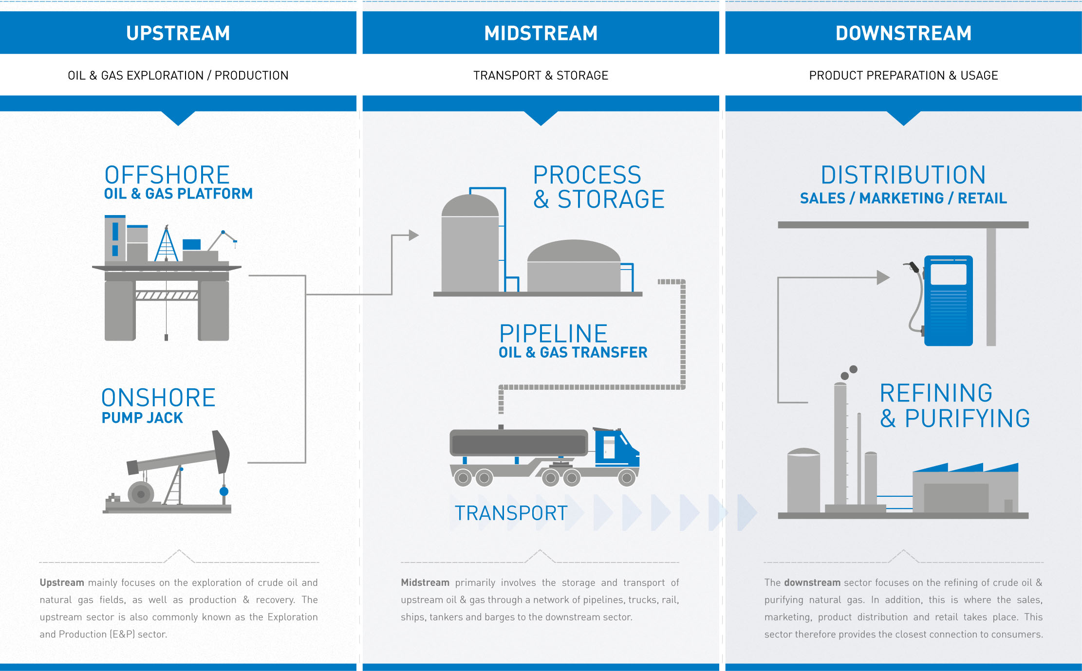 Wajar jika investor merasa bingung dengan jargon yang digunakan ketika menilai operasi yang berhubungan dengan minyak. Kami percaya bahwa sangat penting untuk memahami proses ekstraksi, pemurnian, dan perdagangan komoditas, yaitu rantai produksinya yang secara teknis dapat dibagi menjadi tiga segmen: