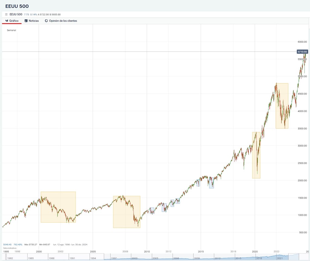 Jika kita melihat indeks S&P 500, sepanjang riwayatnya mengalami koreksi pasar sebesar 10%-20%. Hal ini dalam jangka panjang memberikan peluang luar biasa untuk buy the dip. Sehingga para investor yang menerapkan strategi ini mendapatkan keuntugnan yang besar pada tahun 2024.