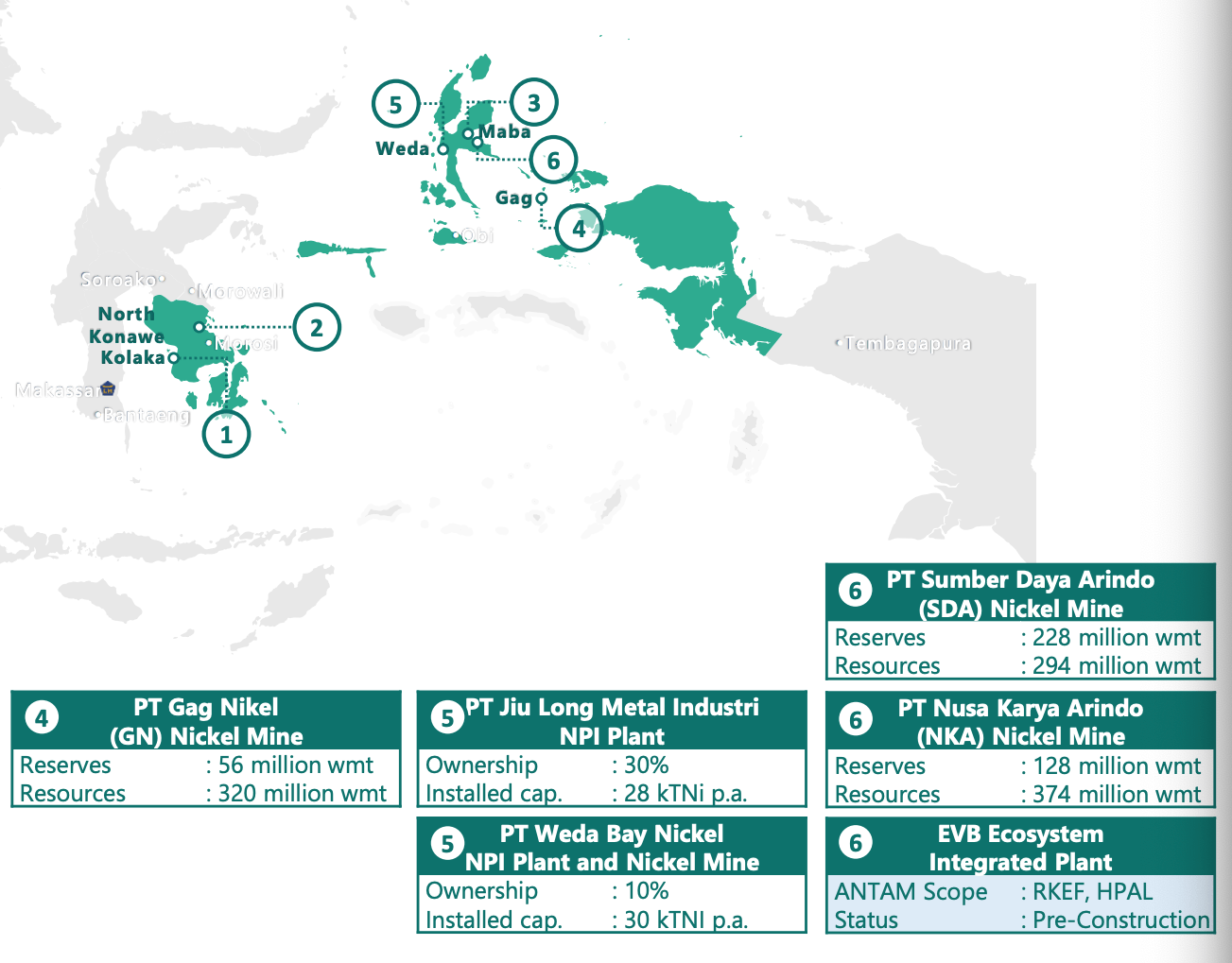 Cadangan nikel terbesar dunia ada di Indonesia dengan 55 juta ton metrik dan Australia dengan 24 juta ton metrik. Kedua negara ini menyumbang lebih dari 60% dari total cadangan nikel di dunia. Sehingga potensi investasi nikel Indonesia cukup menjanjikan di era kendaraan listrik.
