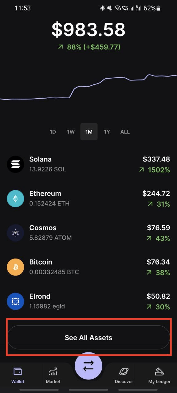Terakhir, sebagai langkah verifikasi, Anda akan mengunjungi cold wallet untuk memastikan bahwa cryptocurrency yang dikirim telah sampai di sana (tidak perlu melakukan tindakan apa pun). Anda harus pergi ke “All Assets” untuk melihatnya (dan menginstal aplikasi untuk melihat cryptocurrency tertentu jika Anda belum melakukannya sebelumnya).