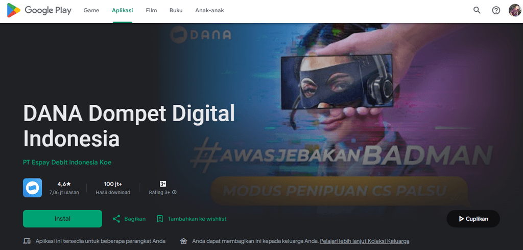 Di Google Play Store, aplikasi DANA telah diunduh lebih dari 100 juta kali dan mendapatkan review pengguna yang sangat baik dengan rating 4,6 dari 7,06 juta ulasan. Dengan banyaknya ulasan pengguna yang bisa kita lihat di Google Play Store, hal ini menunjukkan bahwa aplikasi DANA memang sangat populer di Indonesia dan wajar jika menjadi aplikasi pembayaran online dengan jumlah pengguna terbanyak.
