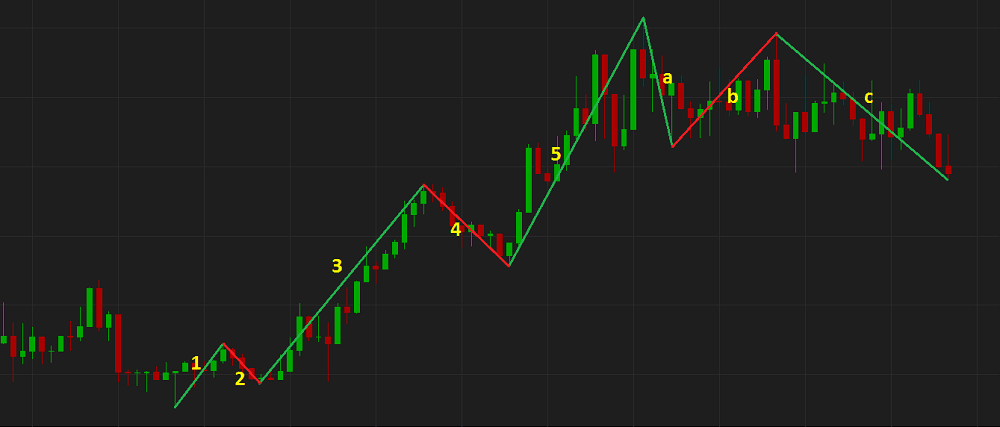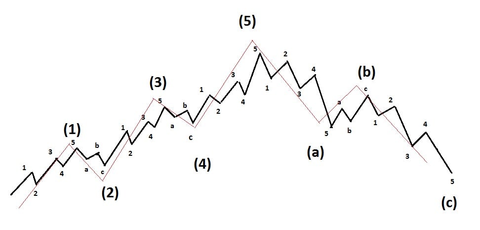 Fase impuls terdiri dari lima gelombang (1-5) dan fase koreksi terdiri dari tiga gelombang (a-c). Secara teoritis, siklus gelombang Elliott akan terlihat seperti ini: