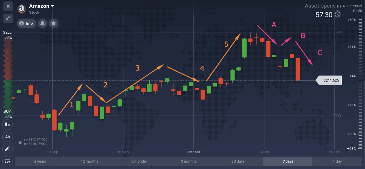 Gelombang A. Pada gelombang A, hal serupa terjadi pada gelombang 1. Sebagai gelombang pertama dari fase baru, terdapat keraguan mengenai kebenarannya dan sulit untuk diidentifikasi sehingga seringkali disalahartikan sebagai pembalikan tren saat ini (fase impuls).