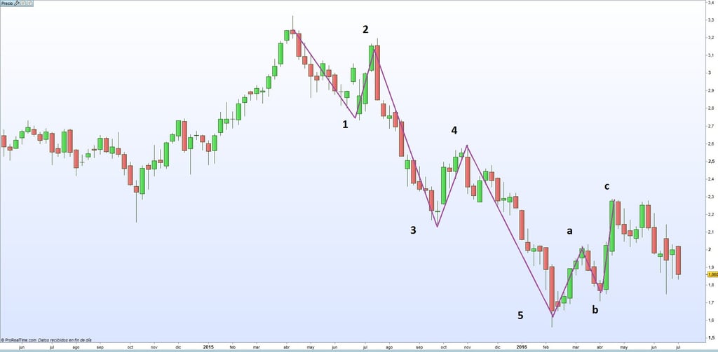 Sebagai ilustrasi, dalam tren bearish mari gunakan grafik ini secara mingguan. Dalam kasus ini, kita bisa mengamati pola yang cukup selaras dengan struktur yang diharapkan: fase impulsif (gelombang 1-5) diikuti dengan fase korektif (gelombang A-C).