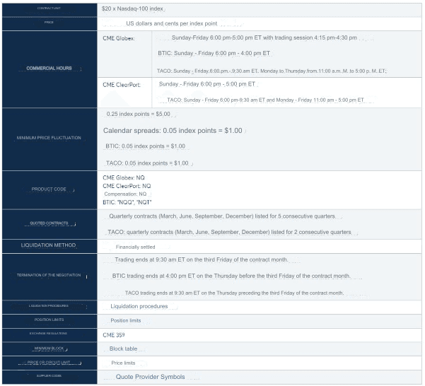Sebelum masuk untuk melihat bagaimana cara kerja E-Mini Nasdaq futures, kami tampilkan tabel yang dibuat oleh CME Group sebagai ringkasan dengan semua karakteristik dan keunikannya.