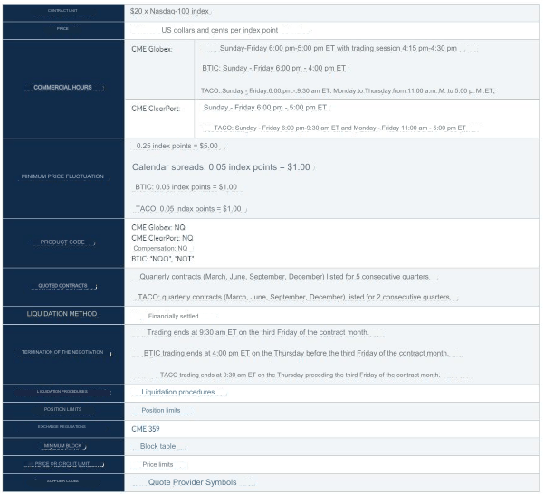 Sebelum masuk untuk melihat bagaimana cara kerja E-Mini Nasdaq futures, kami tampilkan tabel yang dibuat oleh CME Group sebagai ringkasan dengan semua karakteristik dan keunikannya.