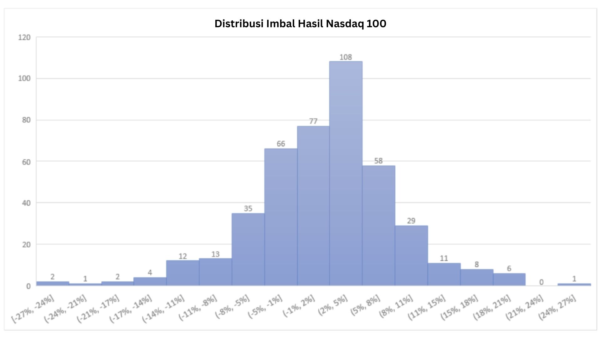 Grafik berikut menunjukkan distribusi return dari Nasdaq 100 dalam rentang bulanan. ini sangat berguna untuk 3 hal utama berikut: