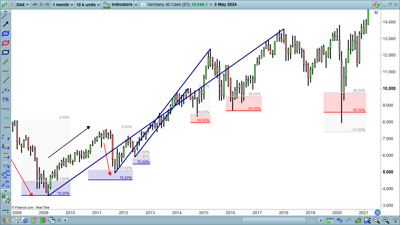 Di sini kita bisa melihat bahwa seiring dengan perkembangan atau “kematangan” struktur, koreksi yang terjadi menjadi lebih kecil. Awalnya, koreksi berada di antara 61,8% hingga 76,4%, tetapi kemudian berpindah ke zona baru yang lebih kecil, yaitu antara 38,2% dan 50% di pasar saham.