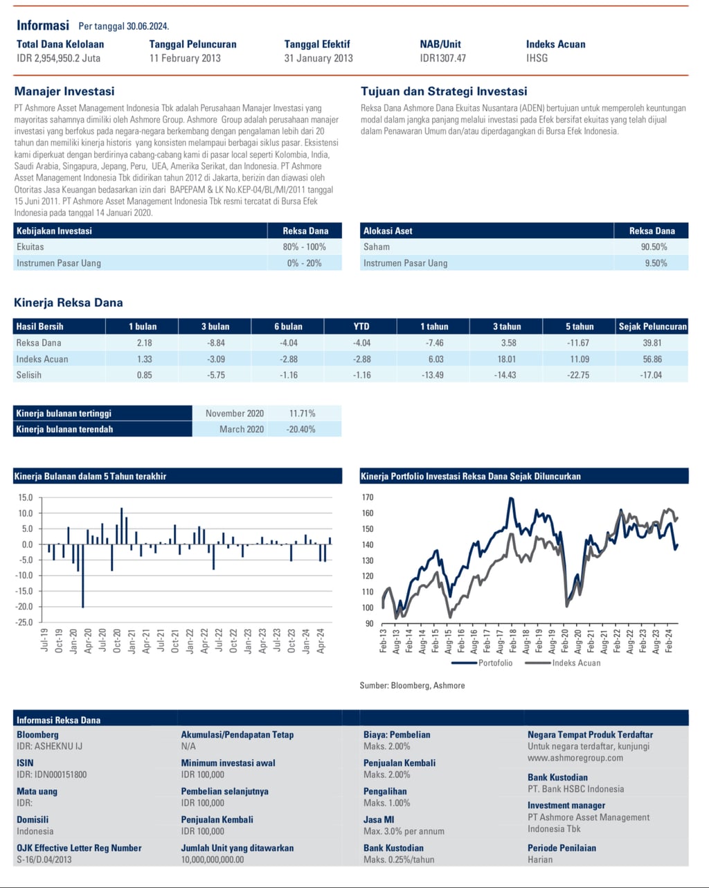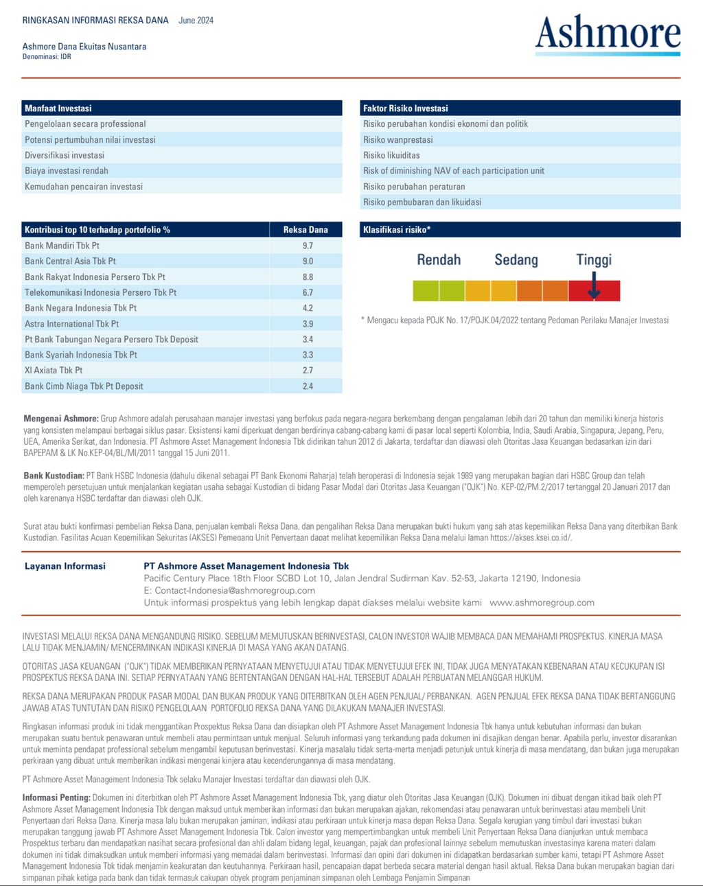 Berikut adalah Fund Fact Sheet Reksa Dana Ashmore Dana Ekuitas Nusantara. Di halaman pertama Anda bisa mendapatkan informasi siapa manajer investasi atau yang mengelola dana Anda, kebijakan investasi, alokasi aset (realisasinya), kinerja dan informasi reksa dana.