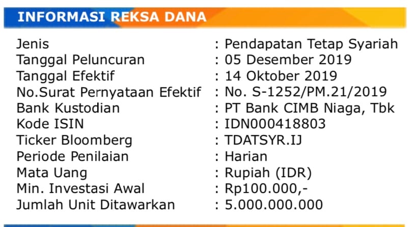 Dalam bagian pertama ini kita dapat menemukan nama reksa dana, Kode ISIN, nomor surat pernyataan efektif dari reksa dana tersebut, siapa manajer reksa dana, dan bank kustodian. Berikut contohnya: