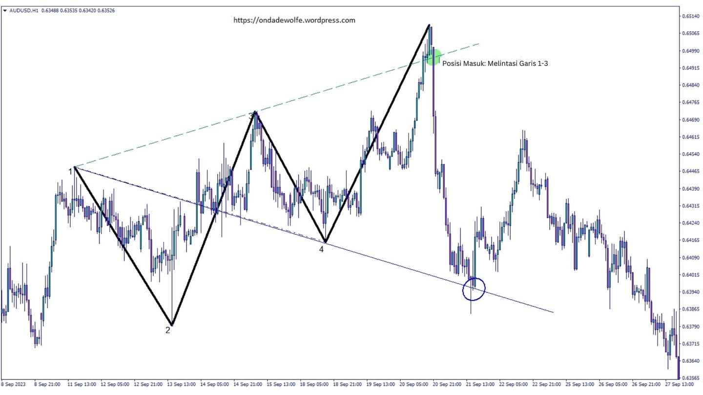 Pembukaan posisi menurut teori aslinya adalah ketika harga melintasi penghubung titik 1-3. Sebaiknya langsung masuk ketika melihat adanya gelombang Wolfe. Sering kali titik 1-3 berada di luar gambar, atau terlalu terlambat. Namun pada artikel ini, kami menyajikannya menurut teori aslinya.