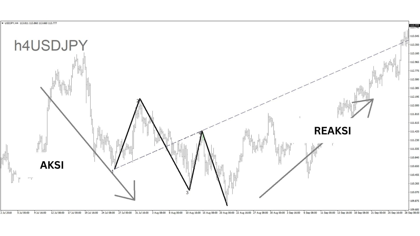 Sekali lagi, pola ini adalah pola yang berlawanan dengan tren. Sehingga pola grafik pada gambar tersebut akan muncul setelah terjadi dorongan atau koreksi. Dorongan ini sebagai tanda akhir dan awal dari reaksi harga yang berlawanan (sesuai dengan hukum "aksi-reaksi").