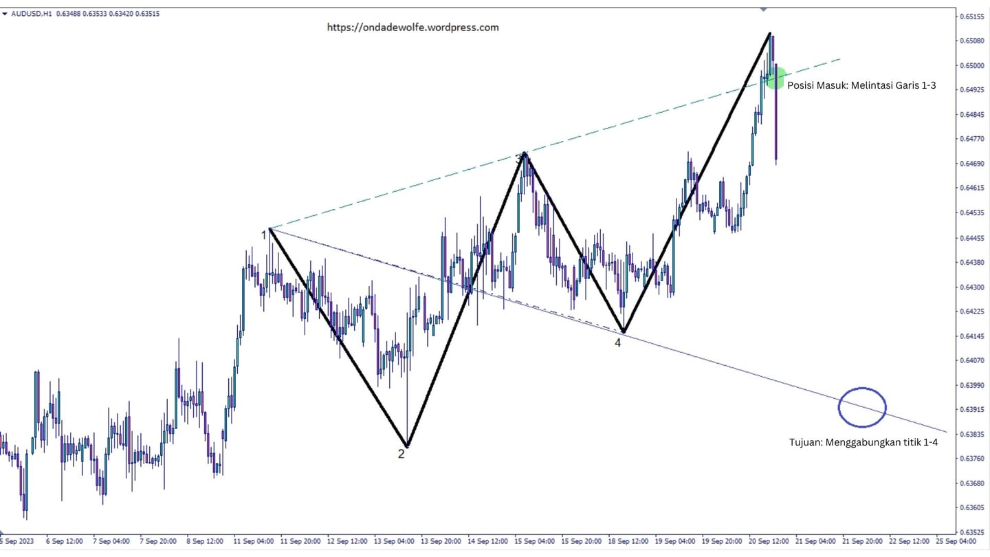 Pembagian titik-titik untuk membentuk Gelombang Wolfe Bearish yang sempurna adalah: