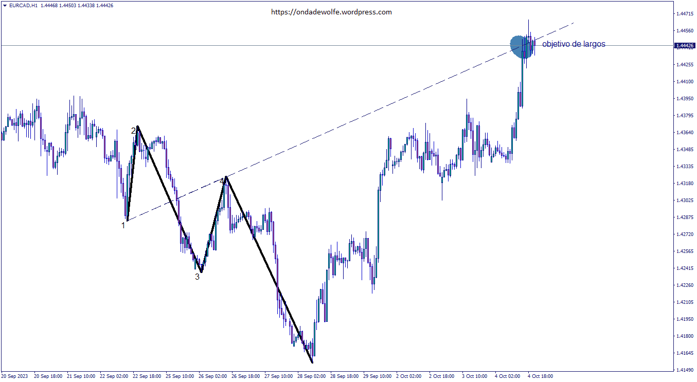 Kami akan mempertimbangkan 2, 3, maupun 4 tujuan atau Take Profits, tergantung pada pola gelombang Wolfe dan konteksnya. Bill Wolfe hanya mempertimbangkan satu target dengan tanda penggabungan 1-4. Sama seperti tanda pada gambar di artikel ini.