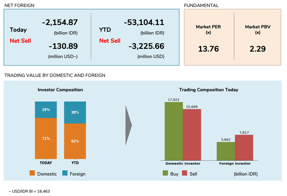 IHSG hari ini (1 September 2025) juga mengalami penurunan 1,21% dari level sebelumnya (29 Agustus 2025). Meskipun penurunannya tidak sebesar hari Jumat kemarin, net outflow asing mengalami peningkatan hampir dua kali lipat, yaitu sebesar Rp 2,15 triliun atau US$ 130,89 juta.