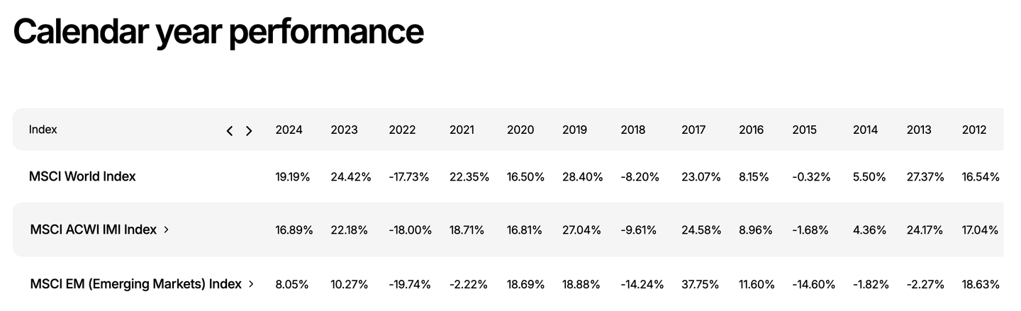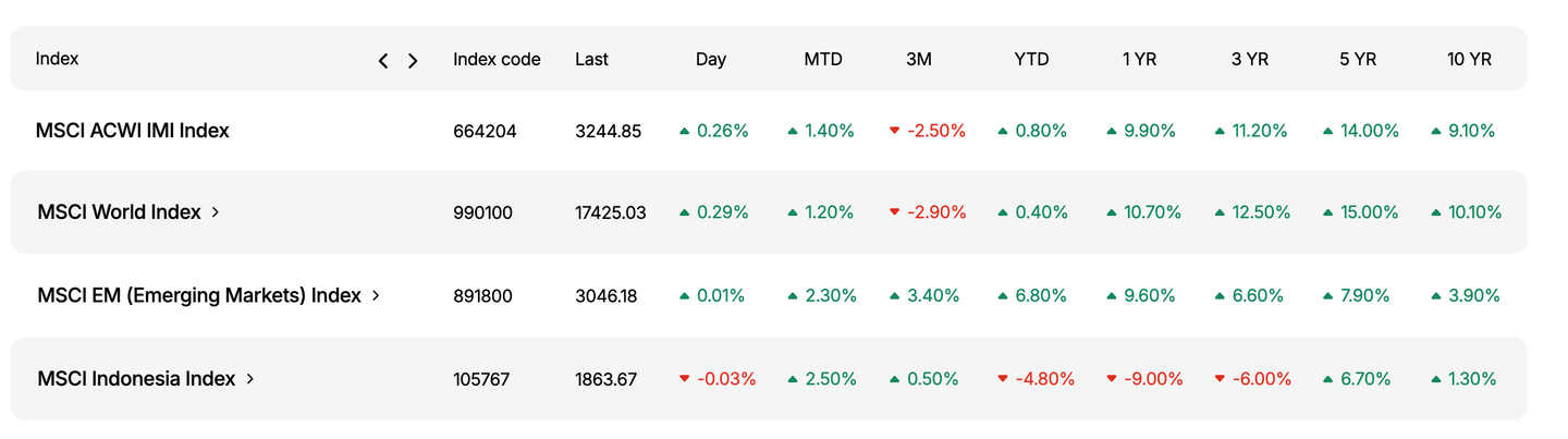 Dalam tabel ringkasan ini, Anda dapat melihat perbandingan antara kinerja indeks MSCI utama dalam setahun terakhir, 3 tahun, 5 tahun, 10 tahun, dan sejak pembuatannya.