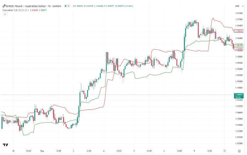 Anda dapat melihat Chandelier Exit pada grafik per jam pasangan GBP/AUD berikut: