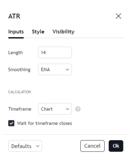 ATR merupakan indikator yang terdapat pada sebagian besar platform trading, sehingga Anda tidak akan kesulitan menemukannya. Misalnya, pada TradingView, cuku cari "Average True Range", maka akan muncul parameter yang harus Anda atur seperti pada gambar berikut: