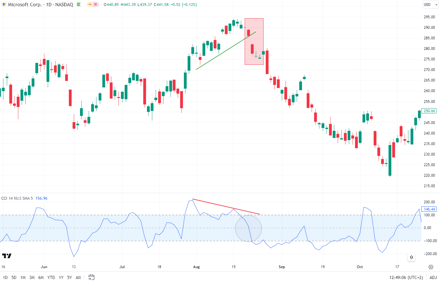 Sementara itu, pada grafik Microsoft, kita dapat melihat divergensi bearish yang terjadi pada Agustus 2022. Sekali lagi, terlihat konfirmasi ganda dari sinyal: dengan melintasi garis nol ke bawah dan dengan penembusan ke bawah (break down) dari garis tren bullish jangka pendek. Ditambah lagi, pada saat yang bersamaan terjadi gap down. Hal ini makin mengonfirmasi terjadinya penurunan harga.