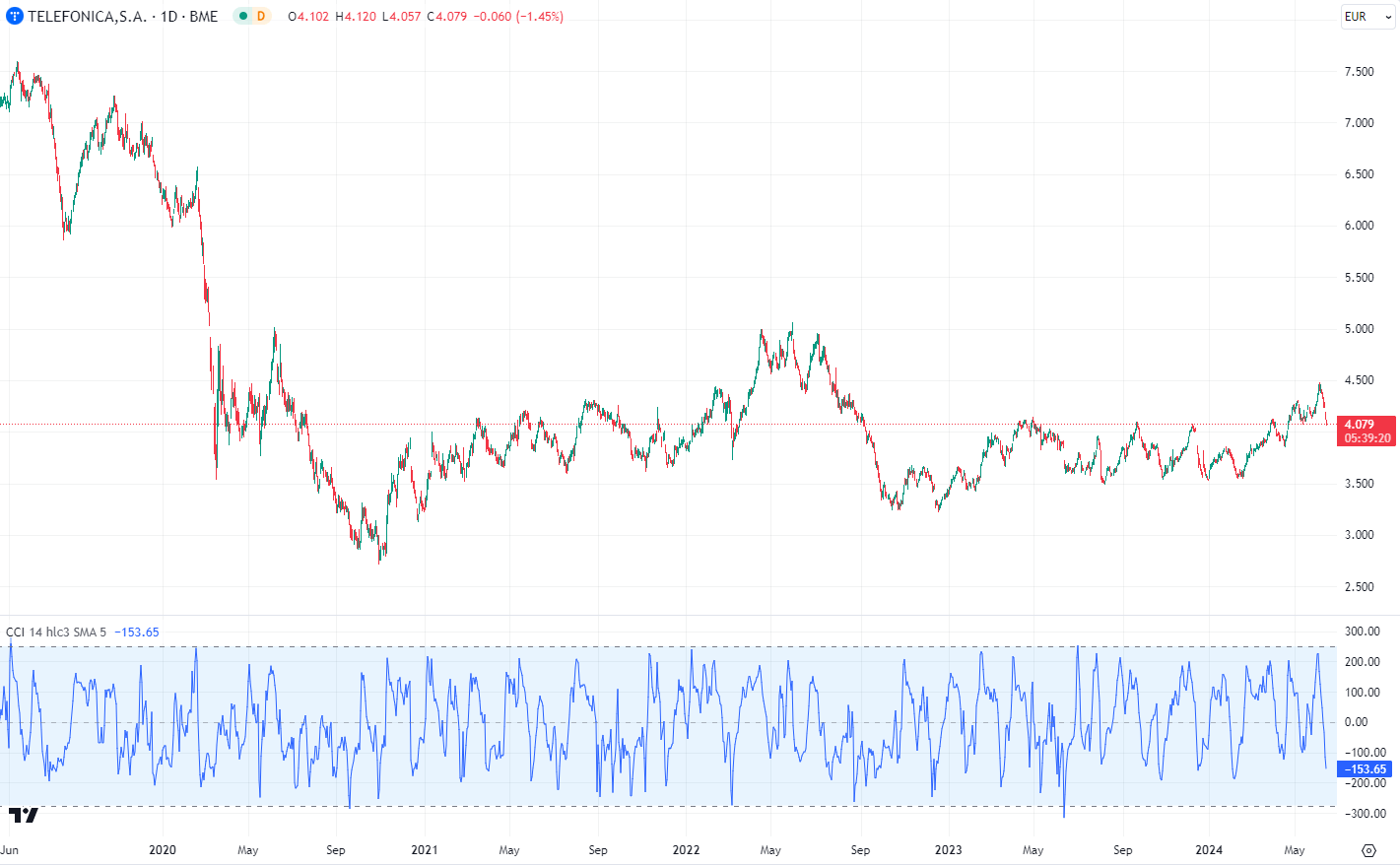Pada grafik harian Telefónica berikut ini, kami telah memperkecil grafik untuk menunjukkan empat tahun terakhir dari riwayat. Anda dapat melihat bagaimana, umumnya, saat menyentuh level +250 harga cenderung melakukan koreksi ke bawah, sementara jika mencapai -275, harga saham biasanya memantul.