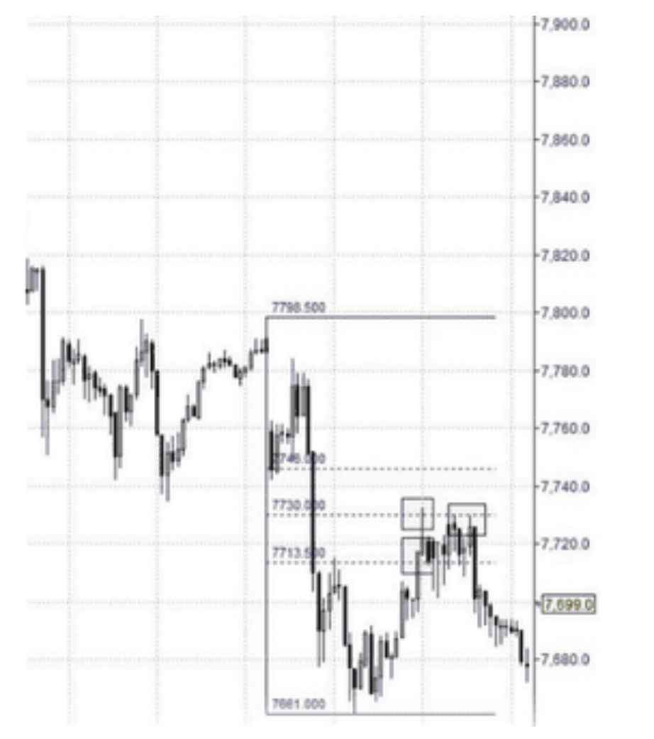 Dalam kasus di atas, kita bisa melihat bahwa titik minimumnya adalah 3126,25 dan titik maksimumnya di 3169,25. Ini memberi kita rentang efektif sebesar 43. Ketika indeks mencapai titik maksimum dalam jangka pendek, kami segera menghitung level Fibonacci retracement. Menarik untuk dicatat bahwa ada support kuat pada level retracement 23,6%, yang menciptakan rentang perdagangan relatif sempit pada hari-hari pertama setelah mencapai puncak. Ada situasi di mana indeks turun di bawah level dukungan ini, namun tidak lama kemudian kami mendapat penolakan terhadap level retracement 38,2%. Semuanya sangat baik sejauh ini.