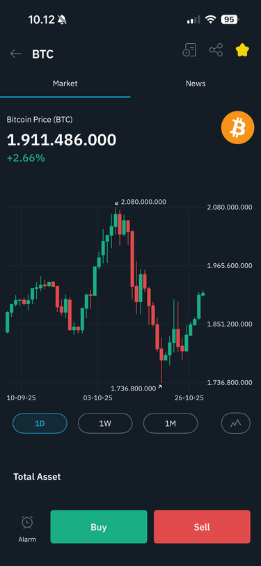Selanjutnya Anda bisa mulai cara trading di Pintu Crypto, setelah melakukan deposit. Cara trading di Pintu Crypto cukup dengan mencari nama koin yang Anda inginkan, misal Bitcoin. Klik koin dan Anda akan melihat grafik harga serta informasi lainnya di aplikasi sebelum klik Buy.