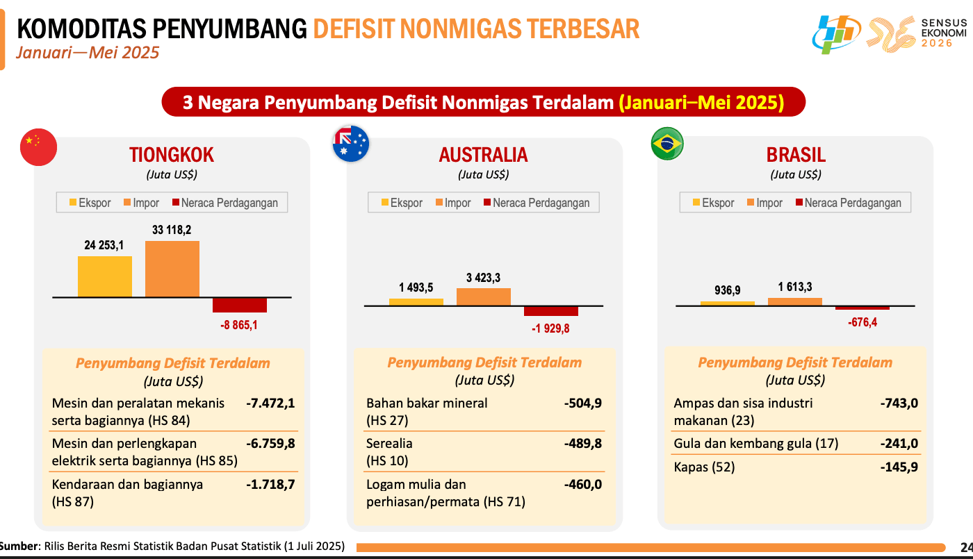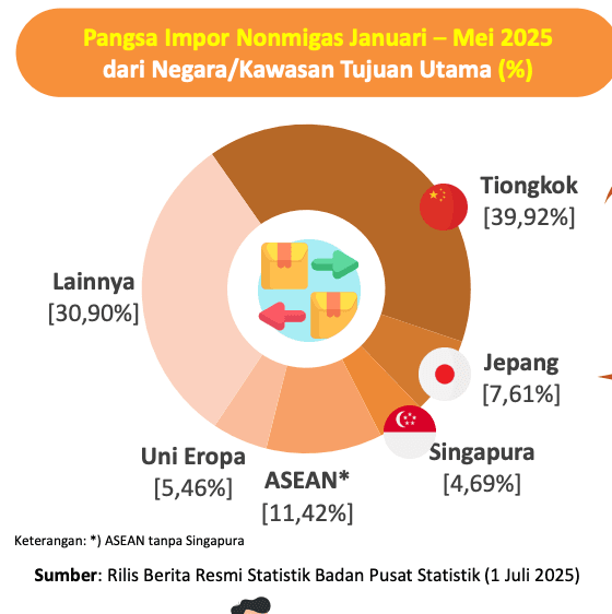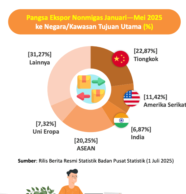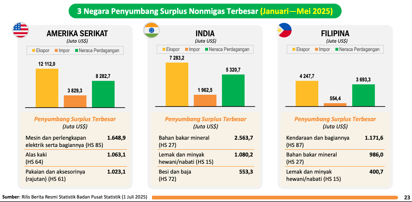 AS dan Uni Eropa masuk dalam mitra dagang utama Indonesia. Pangsa pasar ekspor Indonesia ke AS mencapai 11, 42% sepanjang Januari-Mei 2025, sedangkan ke Uni Eropa mencapai 7,32%. Di mana nilai perdagangan ke Amerika Serikat surplus hingga US$ 8,28 miliar di periode yang sama untuk sektor non-migas.