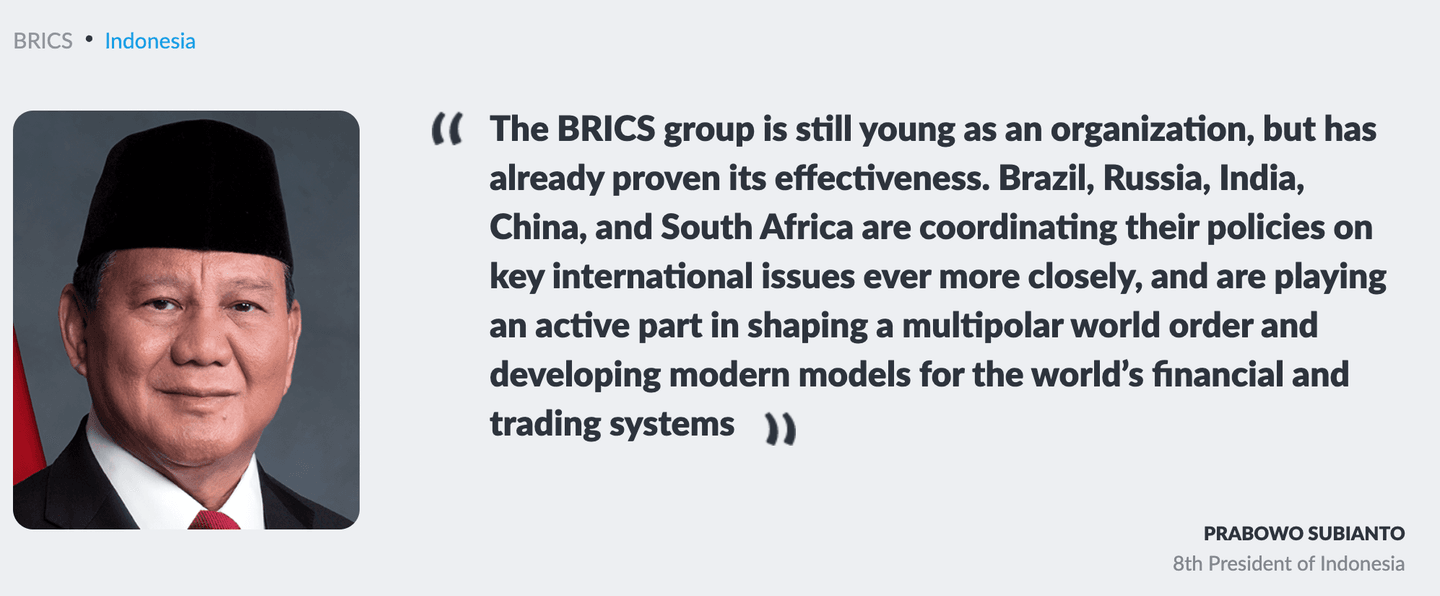 BRICS+ adalah organisasi yang menjadi simbol kekuatan ekonomi baru untuk menyeimbangkan dominasi negara barat dalam tatanan ekonomi dunia. Ini berarti bergabungnya suatu negara ke dalam BRICS dapat memberikan keuntungan strategis dan risiko tertentu yang dihadapi.
