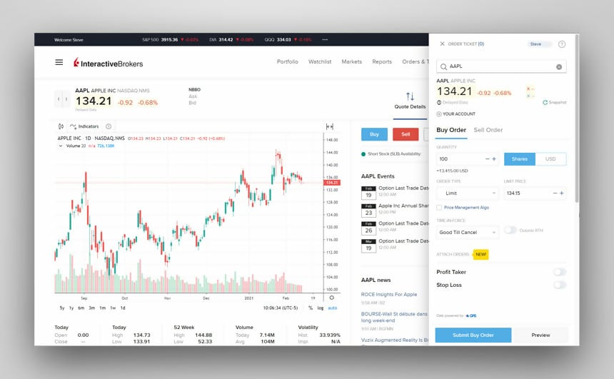 Aplikasi web IBKR berfungsi sebagai panel kontrol tunggal untuk memeriksa penawaran dan melakukan perdagangan, melihat saldo akun, kerugian dan keuntungan, dan pengukuran kinerja utama, pembiayaan, laporan, dan lainnya.