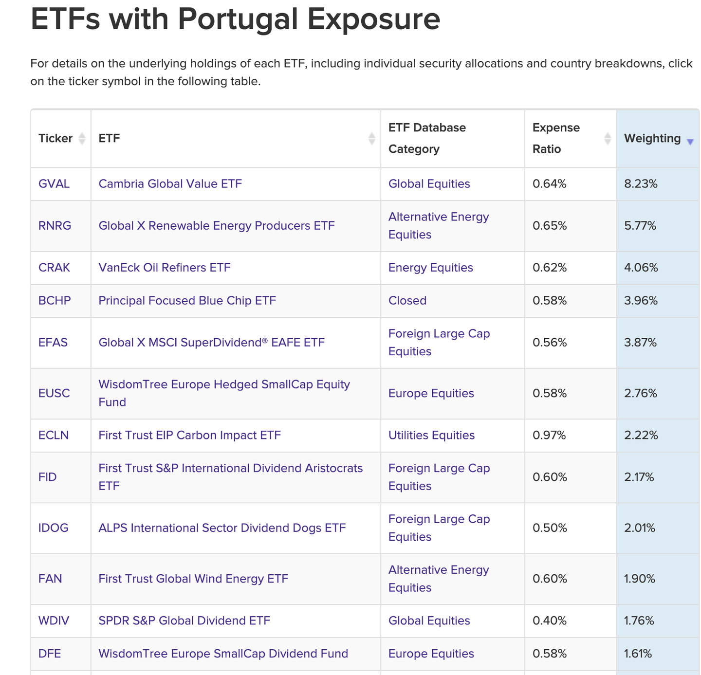 Jika Anda bukan tipe orang yang memilih perusahaan secara individual dan yang Anda cari adalah dana indeks atau ETF yang berinvestasi di Portugal. Sayangnya ada dua ETF yang menggunakan indeks saham Portugal telah dilikuidasi. Sehingga kami menyarankan ETF yang memiliki eksposur ke negara tersebut: