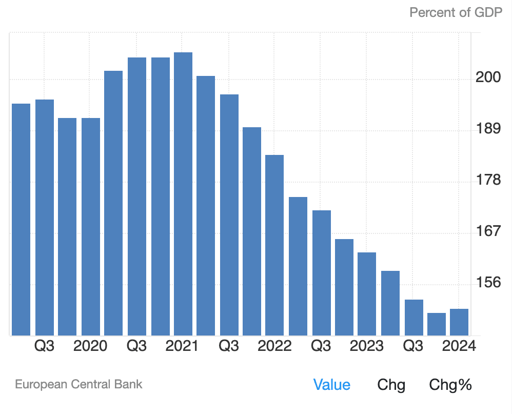 Negara ini menghadapi tantangan utama dalam mengurangi tingkat utang terhadap PDB negara, sambil menjaga defisit publiknya terkendali untuk keluar dari program pengawasan Uni Eropa. Utang luar negeri pemerintah Portugal pada kuartal III-2024 menjadi yang terendah yaitu 150% dari PDB dalam lima tahun terakhir. Portugal mulai berhasil mengendalikan tingkat utangnya sejak kuartal II-2022.
