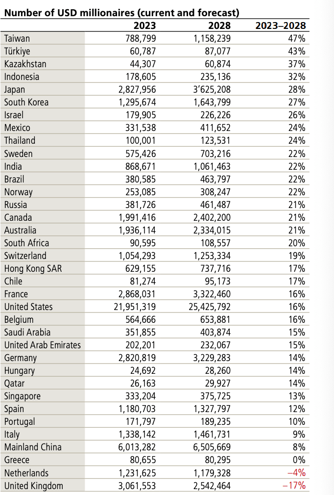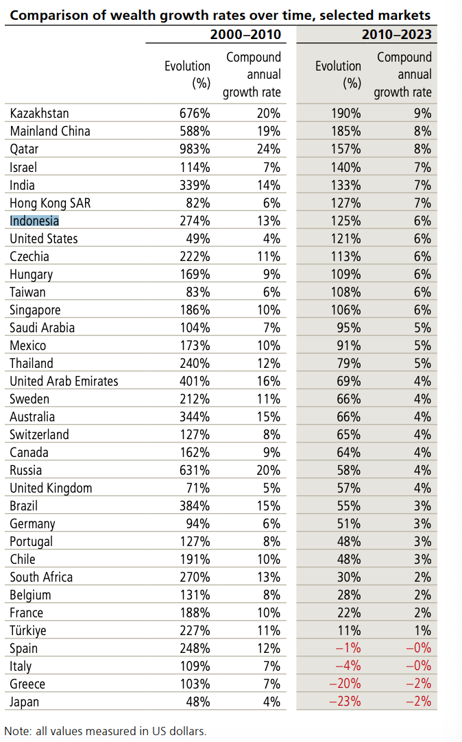 Melansir UBS Global Wealth Report 2024 pangsa pasar orang kaya di negara berkembang akan menembus batas 30% di tahun 2024 dan menjadi 32% di tahun 2028. Menurut data tersebut, jumlah orang kaya di Indonesia dengan nilai kekayaan jutaan dolar AS sebanyak 178.605 orang pada 2023 dan akan meningkat menjadi 235.136 orang pada tahun 2028.