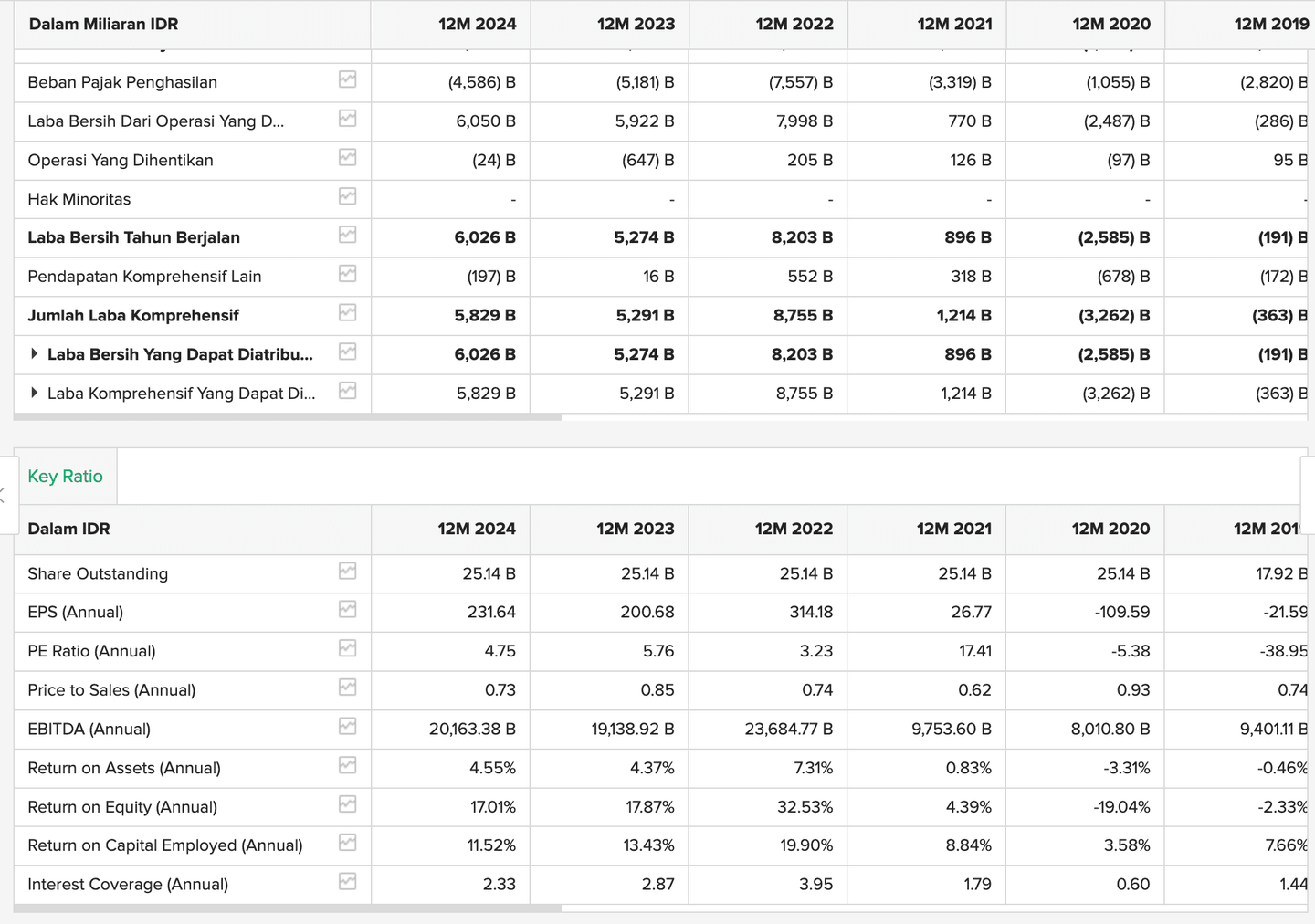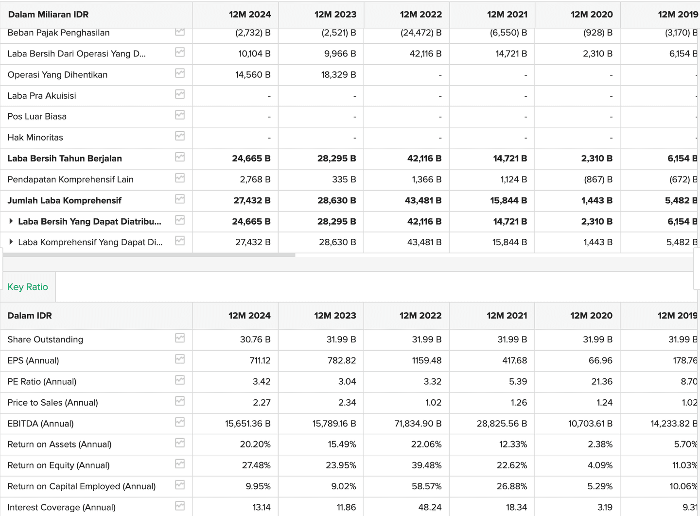 Laba bersih saham sektor energi MEDC pada 2024 mengalami kenaikan setelah menurun di tahun sebelumnya. Begitu pula dengan EPSnya. Namun jika kita lihat dalam tiga tahun terakhir, MEDC mencatatkan perolehan yang stabil mencatatkan laba dibanding tahun 2020 dan sebelumnya.