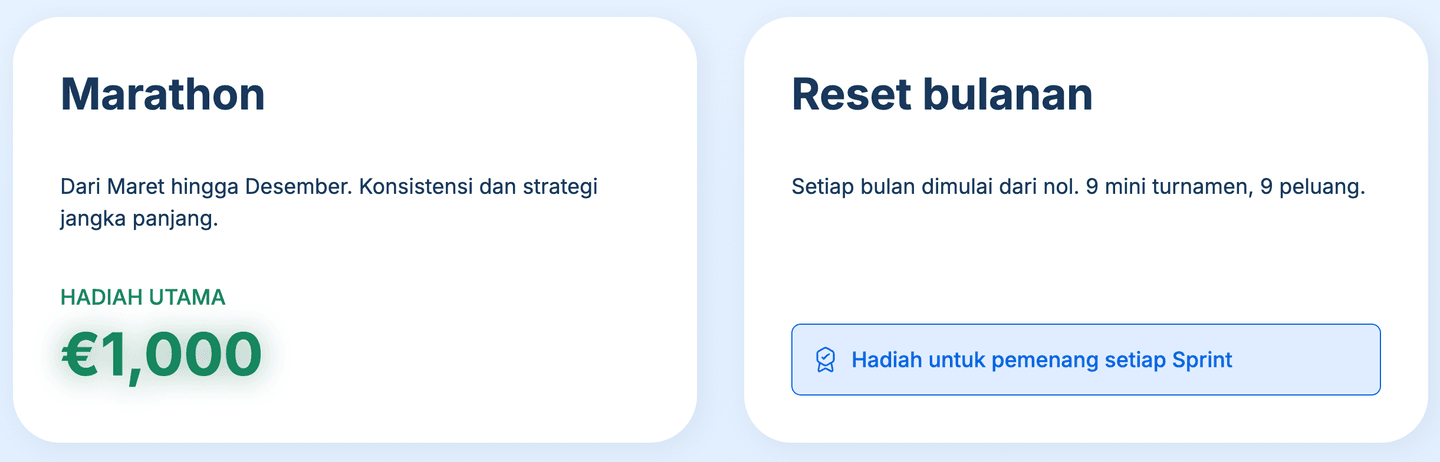| 🏆 Klasemen Umum (Peringkat Global) | Hadiah ini akan diberikan kepada peserta dengan profitabilitas kumulatif tertinggi selama periode 1 Maret hingga 18 April 2026. Berikut penghargaan yang akan peserta terima: * Hadiah senilai €1.000 * Mendapatkan kesempatan wawancara di kanal resmi Rankia * Sertifikat dan piala digital |