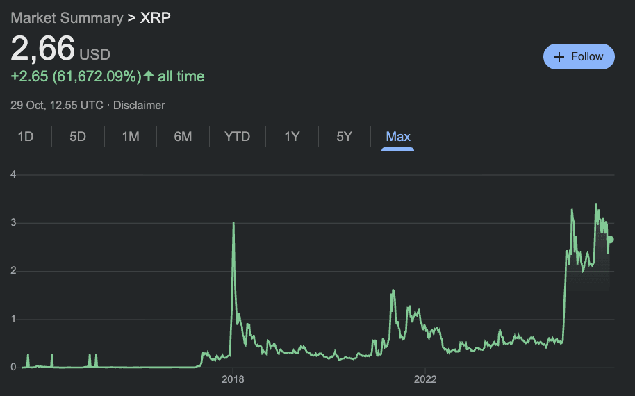 Saat ini XRP menempati peringkat keenam dalam kapitalisasi pasar dengan harga saat ini adalah US$ 2,66 dan pernah hampir mencapai US$ 4. Posisi ini akan terus mengalami perubahan sesuai dengan harga harian yang terbentuk. Adapun data di atas merupakan data per 29 Oktober 2025.