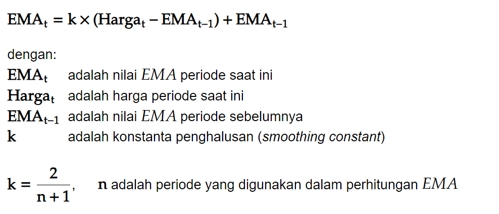 EMA memberikan bobot lebih besar pada harga terakhir, lebih sensitif terhadap perubahan tren, dapat mengantisipasi SMA dan WMA.