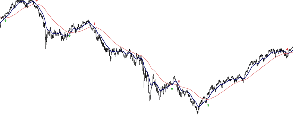 Pada contoh ini, kita melihat persilangan EMA 13 (biru) dan MA 70 (merah). Kita dapat melihat bagaimana strategi jangka panjang dapat berhasil dengan persilangan MA karena menghindari banyak sinyal yang salah. Strateginya adalah membeli ketika MA garis biru melintasi dari bawah ke atas MA garis merah, dan menjual ketika garis biru melintasi garis merah dalam mode menurun.