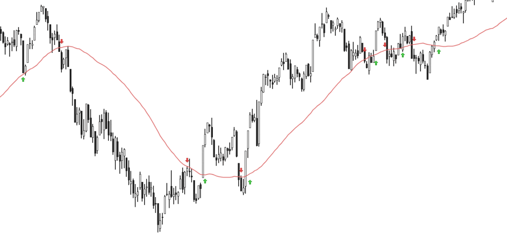 Pada grafik, kita dapat melihat contoh transaksi apa yang akan dilakukan jika mengikuti strategi “harga melewati MA 20“. Dalam warna hijau, kita melihat sinyal beli dan dalam warna merah sinyal jual atau short sell. Kita dapat melihat bahwa ketika pasar berada di sideway trend, banyak sinyal yang salah. Akan tetapi, ketika market berada dalam tren yang jelas, strateginya berjalan dengan lebih baik.